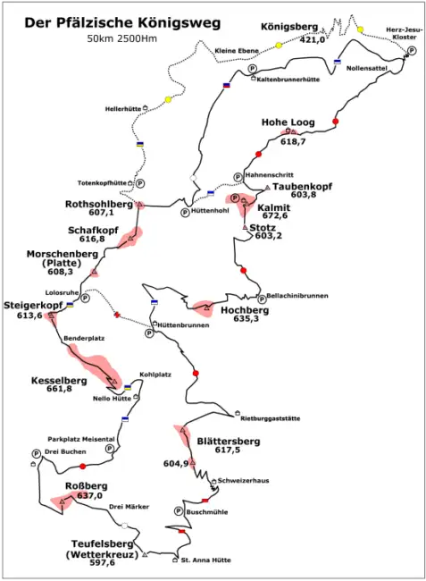 Am Samstag dem 25. April gibt es dann irregulär für erfahrene WanderMutige aber noch ein Bonbon obendrauf: der Pfälzer Königsweg, über 50 Kilometer lang und mit über 2500Höhenmeter im Aufstieg. Die Strecke verbindet schön und legendär die zwölf 600er der Südpfalz miteinander.