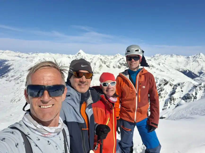 Bei Sonnenschein führte uns der vierte Tourentag ins Val Funtauna und weiter zum Scalettahorn. Die heikle Lawinensituation erforderte eine umsichtige Aufstiegsroute. Nach passieren des Piz Grialetsch wählten wir den zusätzlichen Aufstieg zum Piz Sarsura. Mit der anschließender Abfahrt über das Vadret da Grialetsch zur Grialetschhütte wurde dieser Tag mit rund 1600 Höhenmetern und 21 Kilometern zur konditionellen Schlüsseletappe.