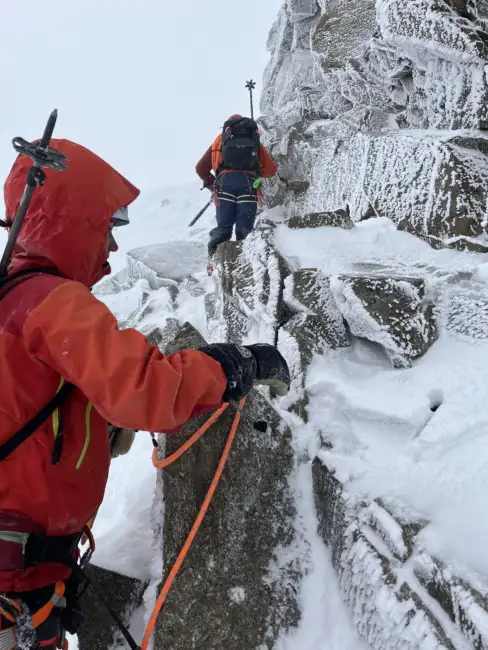 Die Königsetappe zum Piz Kesch stellte uns bei schlechter Sicht und leichtem Schneefall vor besondere Herausforderungen. Über den Gletscher ging es bis zum Skidepot, bevor die letzten 200 Höhenmeter mit Steigeisen und Pickel über einen ausgesetzten Grat teilweise mit Seilsicherung zum Gipfel führten. Während größere Gruppen umkehrten, wurden wir mit einem einsamen Gipfelerlebnis belohnt.